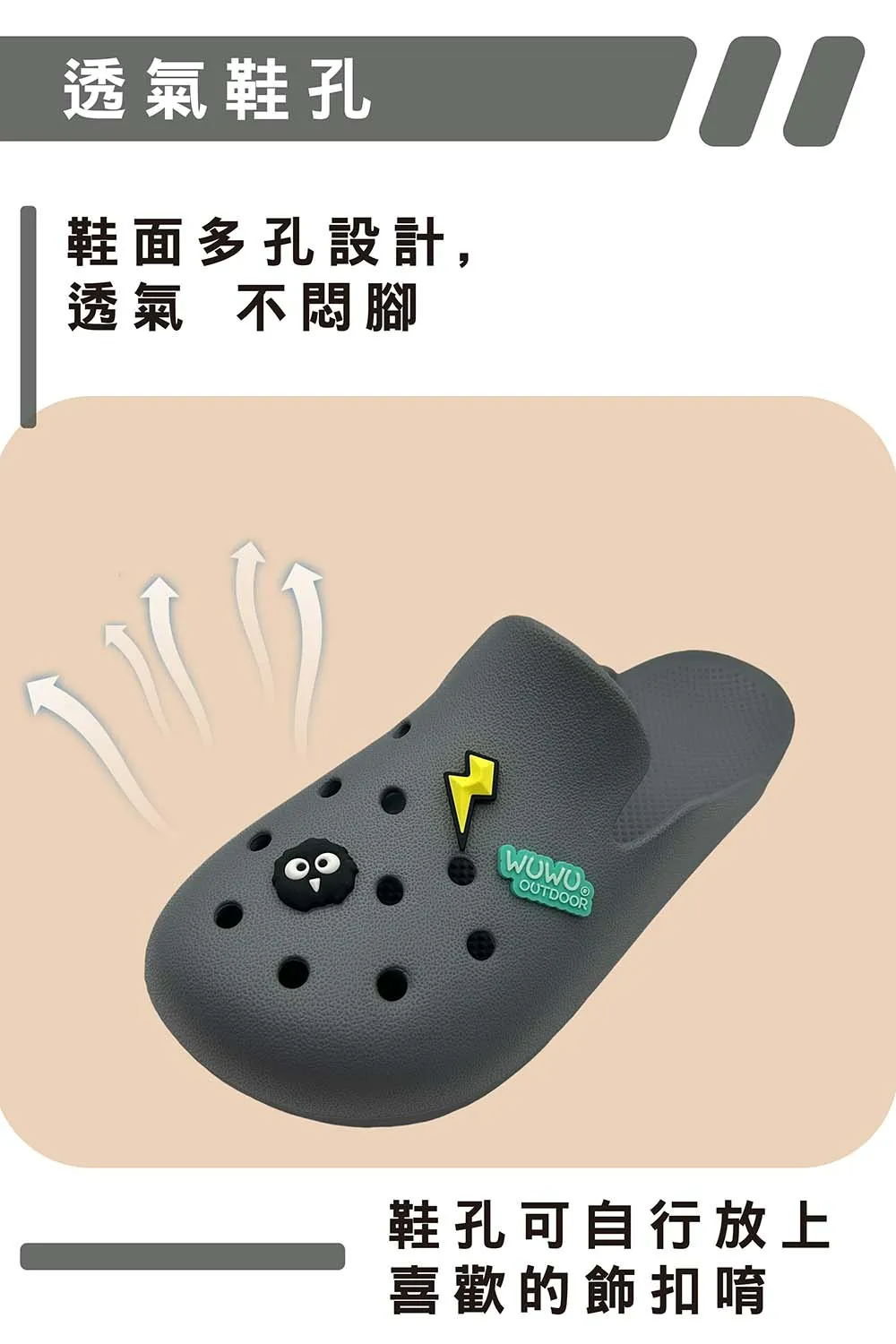 B71 沐樂布希風洞洞拖鞋,結合厚底支撐與透氣洞洞結構,適合居家穿著,也能應付外出買東西、通勤途中或短時間活動。半包式鞋型提供適度包覆,走動時更穩定,同時保持穿脫的便利性。